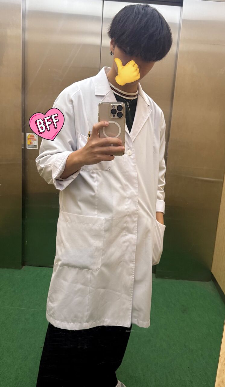 僕もたま~に職場の実験で白衣を着ますけど、なんだか白衣の形状というか種類が違うなあ……(って、本当は中身の人間の年齢が一番違うんですけどね(*´∀`))