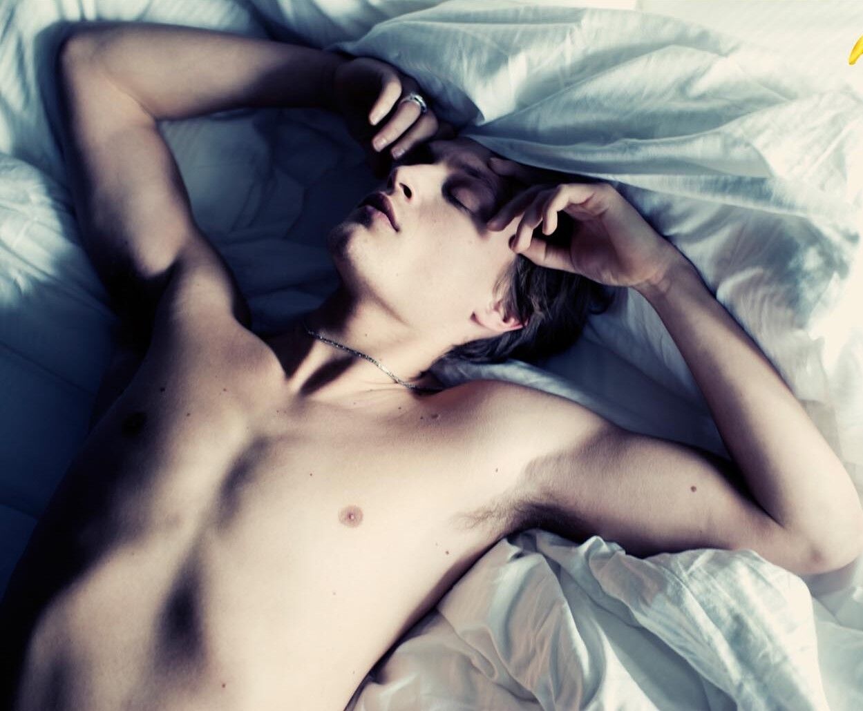首筋から胸板、腹筋へと指先を伸ばし
